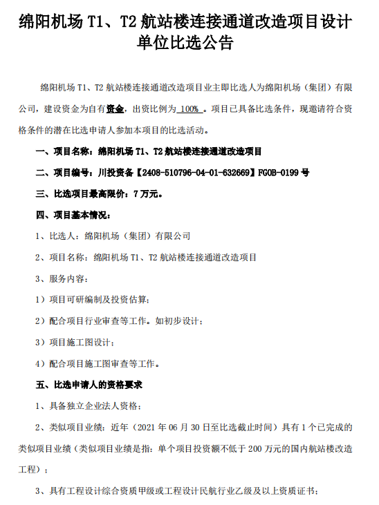 綿陽(yáng)機(jī)場(chǎng) T1、T2 航站樓連接通道改造項(xiàng)目設(shè)計(jì)單位比選公告